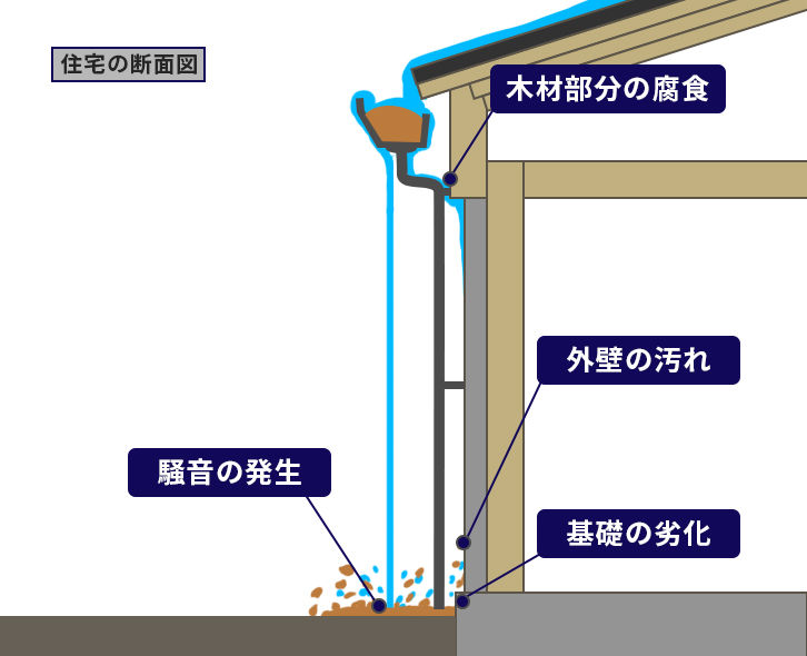 雨樋詰まりで正しく排水できないと、1箇所からまとまって勢いよく雨水が落ちてくることになります。雨水がバシャバシャと下屋やカーポート屋根に落ちる音で「眠れないほどだった」とご相談をいただくこともありました。これがご近所さんのお家にかかっているとする冷や汗ものです。ちなみに雨樋掃除をするきっかけNO.1は「ご近所さんからの指摘」です。最悪の場合、損害賠償請求や訴訟などに発展することも考えられます。