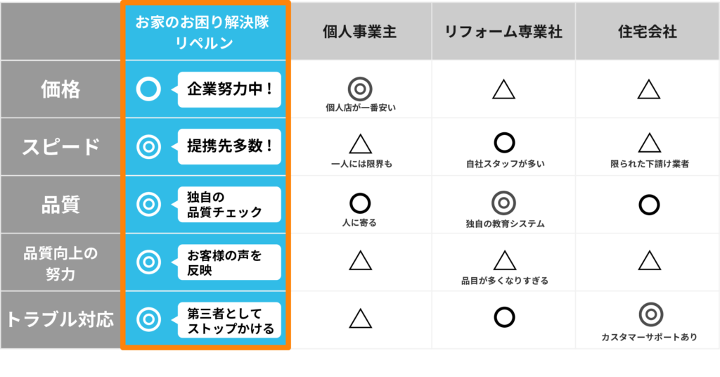 日々のお困り解決隊 リペルンはお家の「困った」「どうしよう」をいち早く解決するサービスを提供しています。独自のシステム構築により依頼主と施工業者をおつなぎし、どこよりも早く、そして納得のコスパを実現しております。