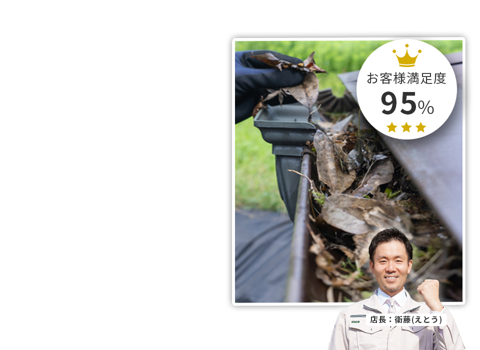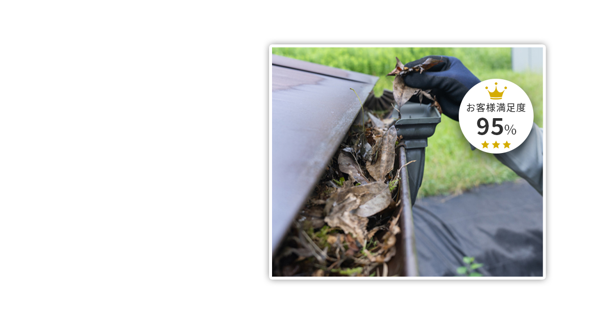 雨樋掃除を安く請け負う会社はたくさんあります。しかしその結果「作業が乱暴で、屋根に傷がついた」などかえって状況が悪化するケースもあります。当社が派遣するのは、雨樋掃除のエキスパート。 施工箇所だけでなく家全体のことを考えた作業で、長く住むためのお手伝いをいたします。