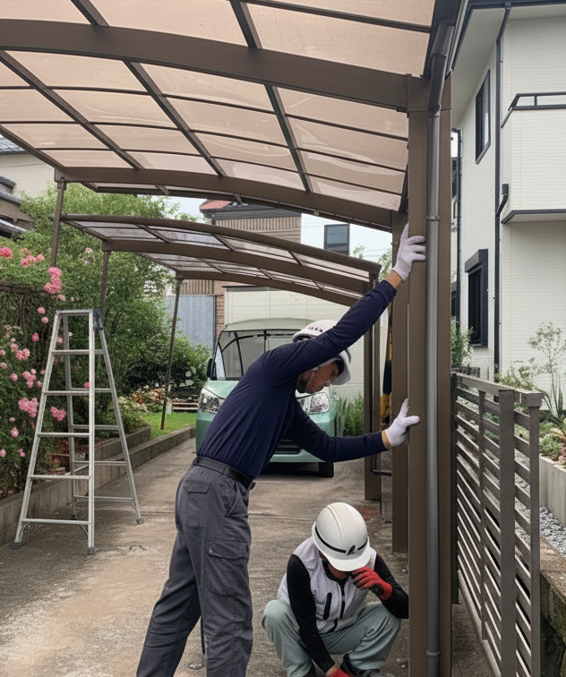 カーポートの不具合は、必ずしも全撤去が必要とは限りません。ちょっとした調整や部品の一部交換だけで改善するケースもあります。当店では現地で原因を確認し、必要最低限のプランをご提案致します。