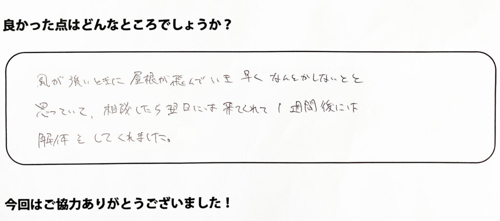 風が強いときに屋根が飛んでいき早くなんとかしないとと思っていて、相談したら翌日には来てくれて1週間後には解体をしてくれました。本当に助かりました。