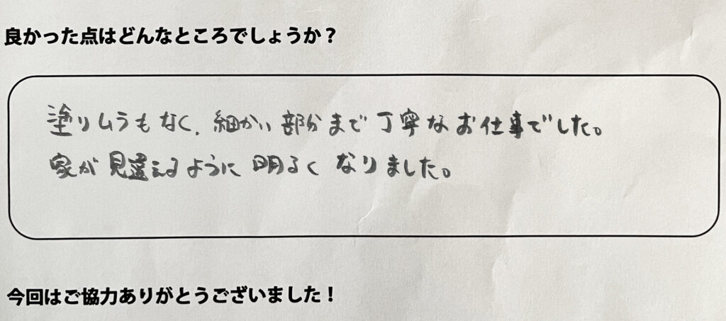 塗りムラもなく、細かい部分まで丁寧なお仕事でした。家が見違えるように明るくなりました。