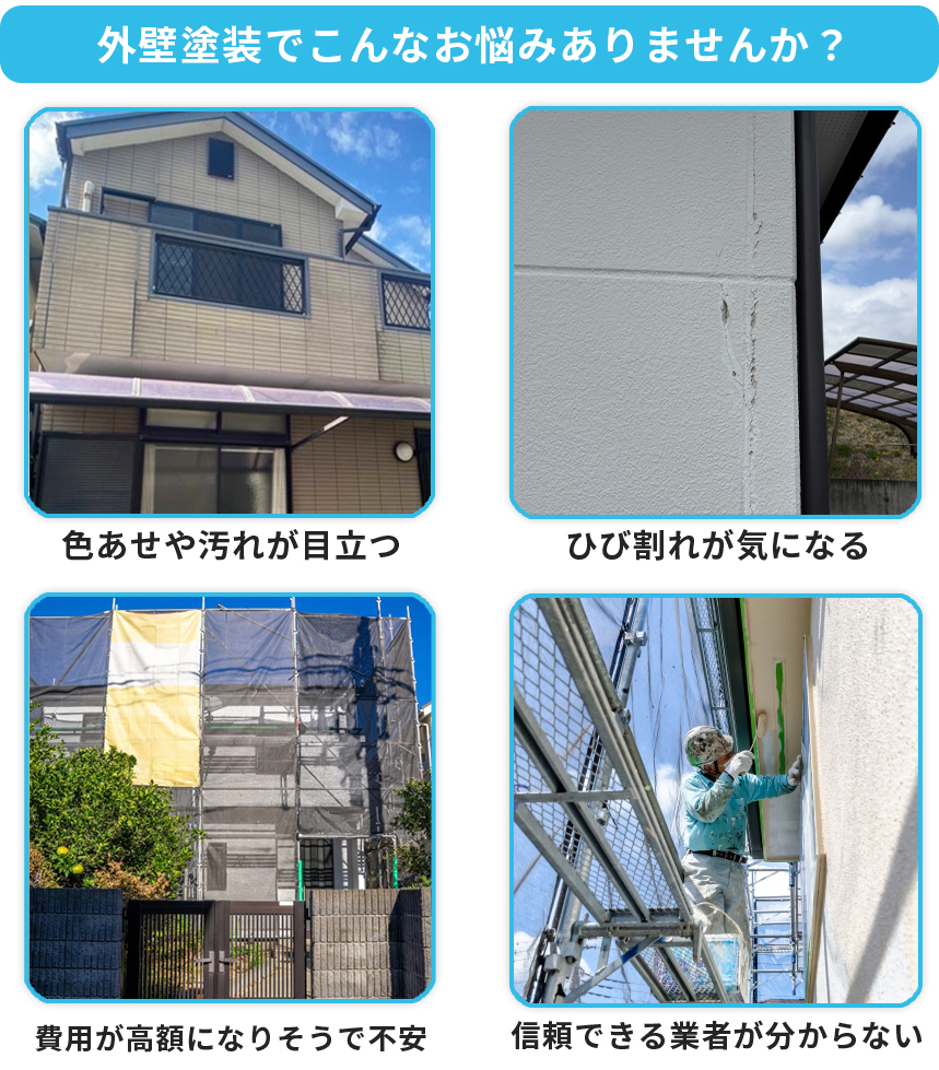 メッセージ:外壁は日々の雨風や紫外線で少しずつ傷んでいきます。「色あせが気になる」「ひび割れを放置して大丈夫?」と感じても、どこに頼めばいいのか分からず不安に思う方も多いのではないでしょうか。