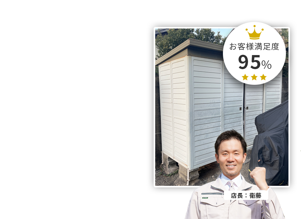 メッセージ:自身も長年戸建てに住んでいるがゆえに様々なお家のお困りごとを体験してきました。その中でも物置解体はどこに頼めばいいのか分かりづらいものだと思います。物置は家と同じで使わないと老朽化が早まり、カビや害虫の発生に繋がります。当店は物置撤去プロ集団です。お客様のお悩みを迅速かつ適切に解決いたします。作業内容と価格に自信があります。誠心誠意撤去作業をいたしますので、まずはお気軽にご相談ください。