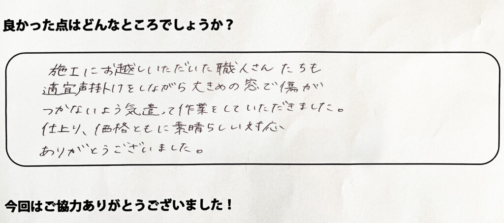 施工にお越しいただいた職人さんたちも適宜声掛けをしながら大きめの窓で傷がつかないように気遣って作業をしていただきました。仕上り、価格ともに素晴らしい対応ありがとうございました。