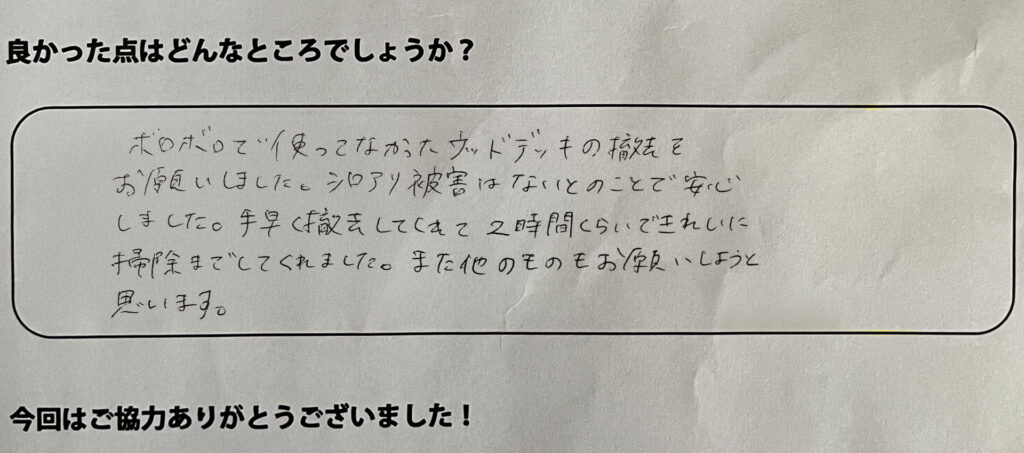 ボロボロで使っていなかったウッドデッキの撤去をお願いしました。シロアリ被害は無いとのことで安心しました。手早く撤去してくれて2時間くらいで綺麗に掃除までしてくれました。また他のものもお願いしようと思います。