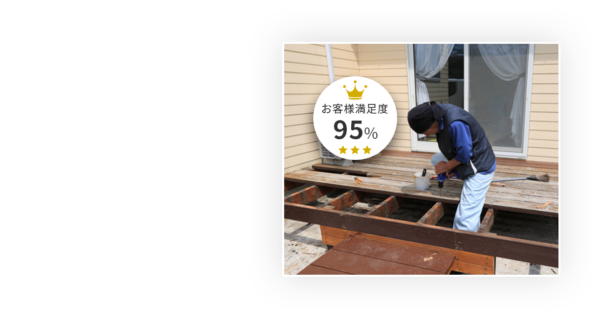 ウッドデッキ解体を安く請け負う会社はたくさんあります。しかしその結果「作業が乱暴で、傷がついた」「ご近所さんに迷惑がかかったかも」などかえって状況が悪化するケースもあります。当社が派遣するのは、ウッドデッキ解体のエキスパート。見えない作業にも手を抜かず一つひとつ丁寧に、確かな知識と巧みな技術で素早く対応し、納得できる工事をお約束いたします。 施工箇所だけでなく家全体のことを考えた作業で、長く住むためのお手伝いをいたします。