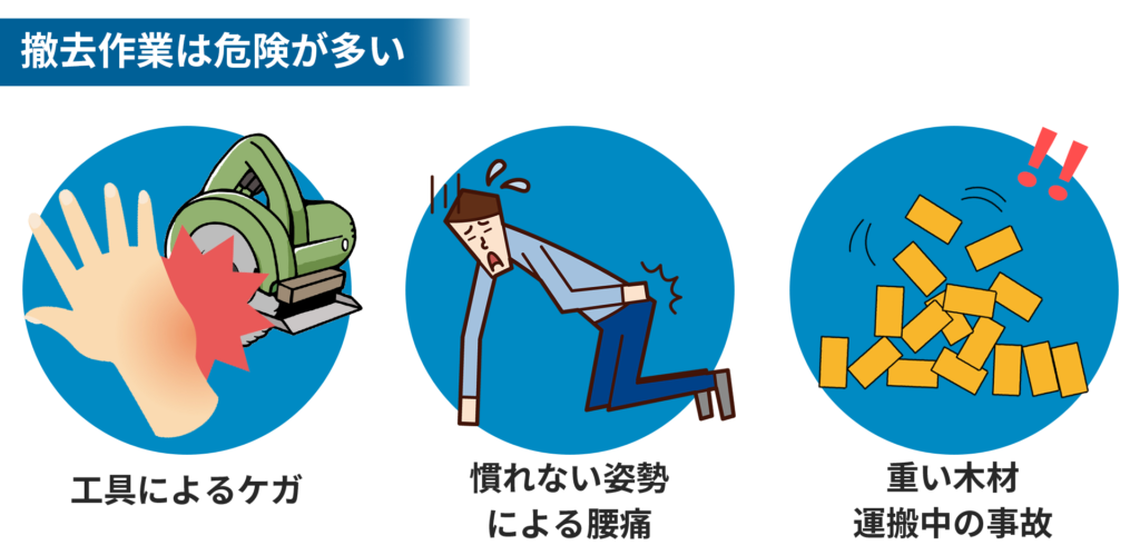 ウッドデッキの規模によっては、DIYで解体してしまった方がコストパフォーマンスが優れているケースも少なくありませんが、初めての作業となるとそれなりの時間がかかる上、誤った工具の使い方による手指の損傷、慣れない姿勢での腰痛、夏場は熱中症などの危険も伴いますので、少しでも不安がある場合は思い切ってプロに任せてしまいましょう