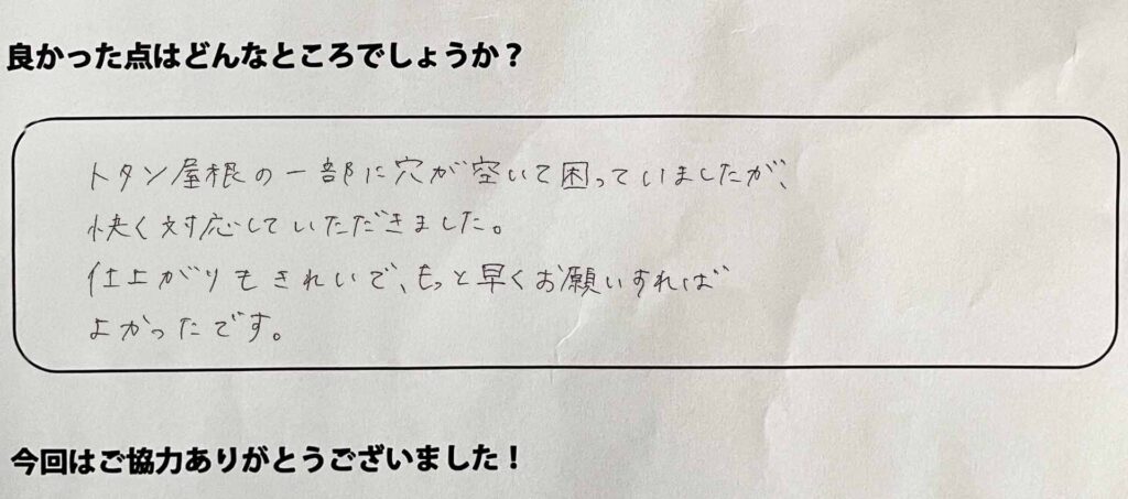トタン屋根の一部に穴が空いて困っていましたが、快く対応していただきました。仕上がりもきれいで、もっと早くお願いすればよかったです。